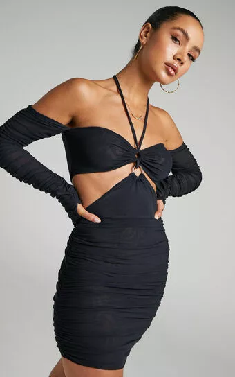 Dance the night away in the BY DYLN – Lumi Dress! It’s shaped with a sweetheart neckline that forms from ruched bust cups and halter neck straps. Cut outs are featured at the waist, revealing an open back that continues to a ruched bodycon mini skirt complemented with cold shoulder long sleeves. Style it with statement sandals and bold makeup for a daring party look!
