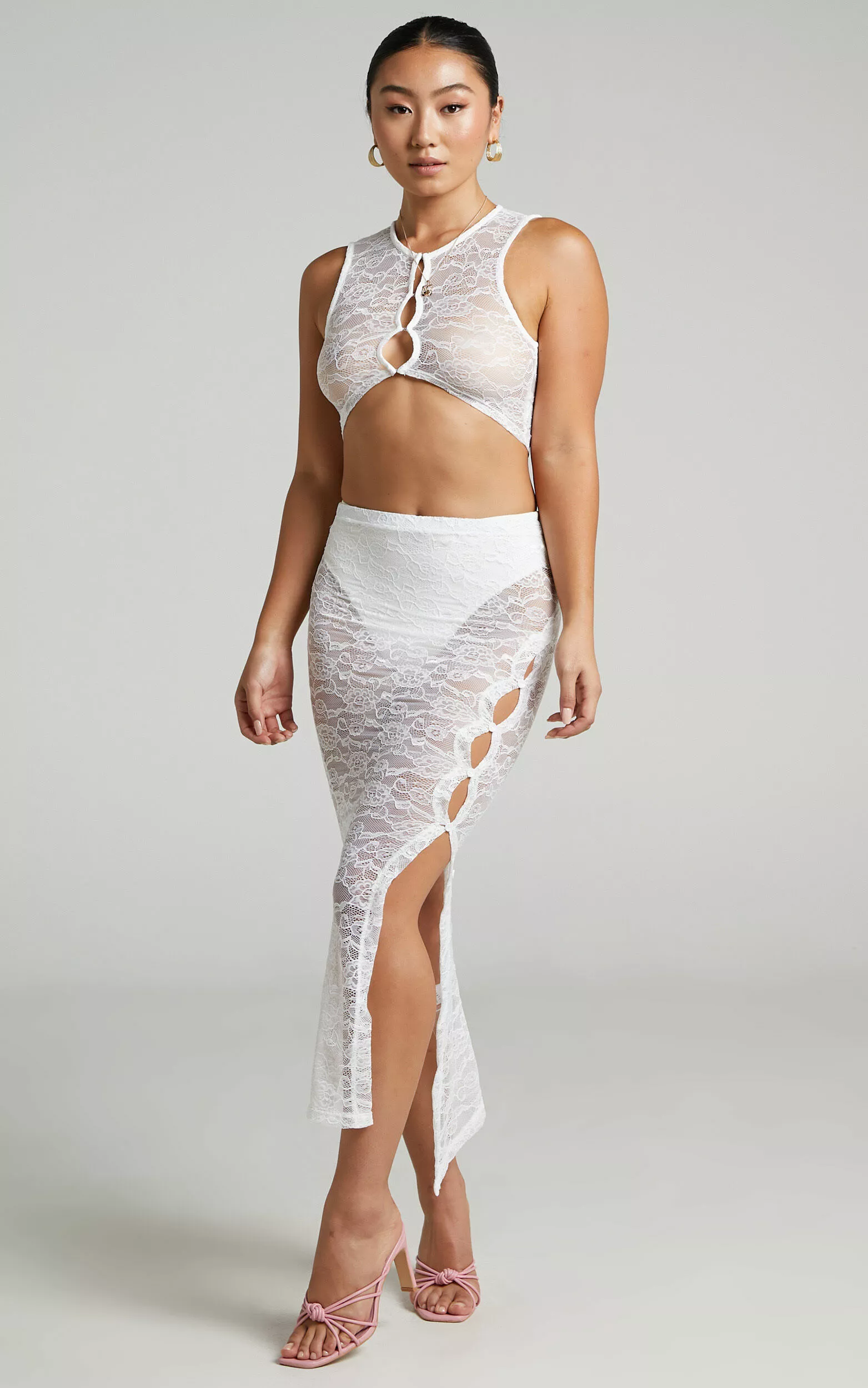 Pair this hot piece with the matching Lioness – Mayfair Lace Crop in White and finish off the look with statement earrings and the Novo – Zaci Heels in White!