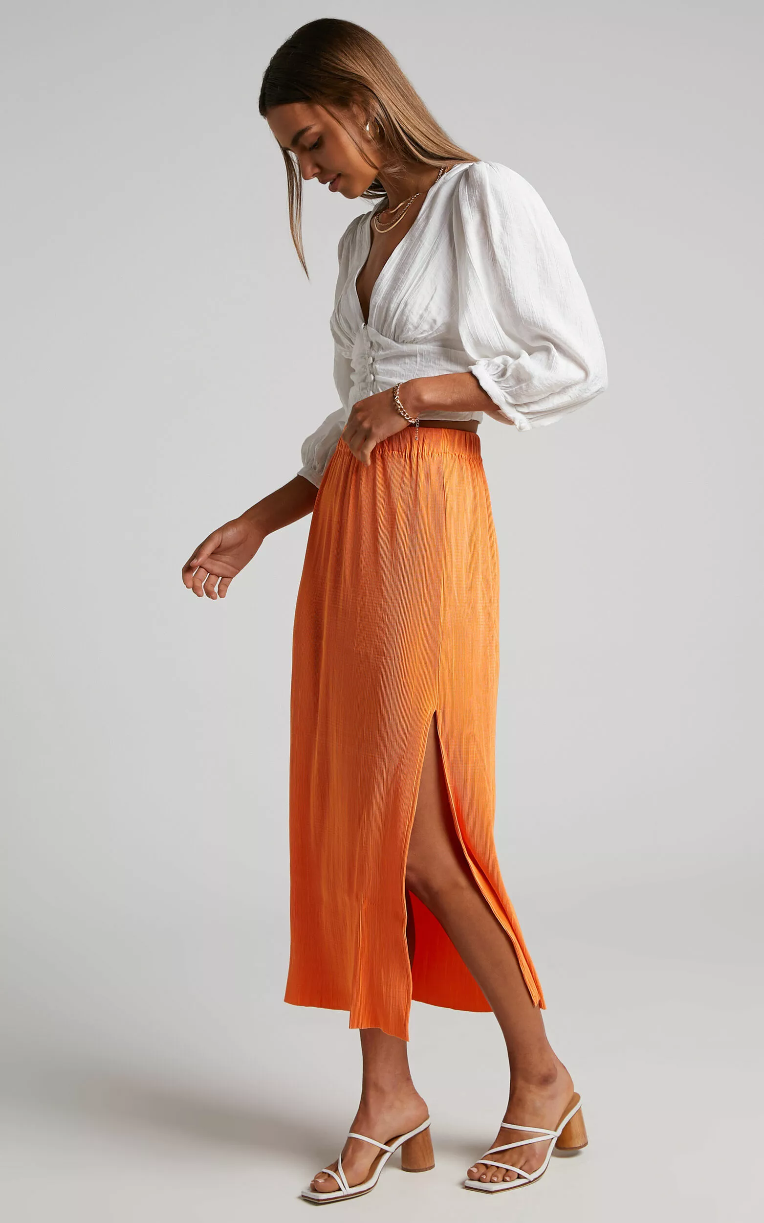 Wear it for a casual day out with plain white tee and chunky sneakers or for a brunch date with the matching Amarante Blouse – Plisse Button Up Blouse in Orange and heeled sandals!