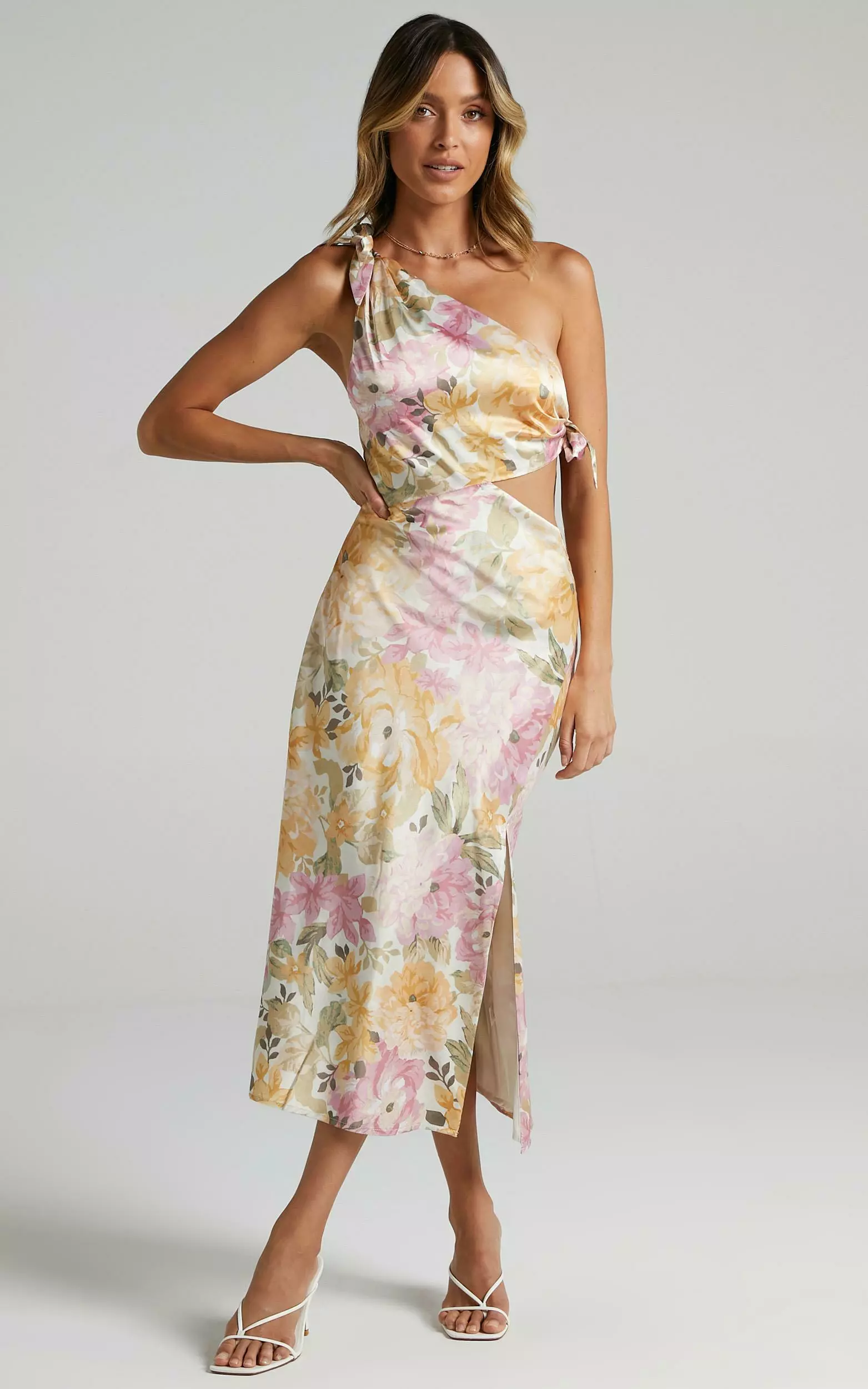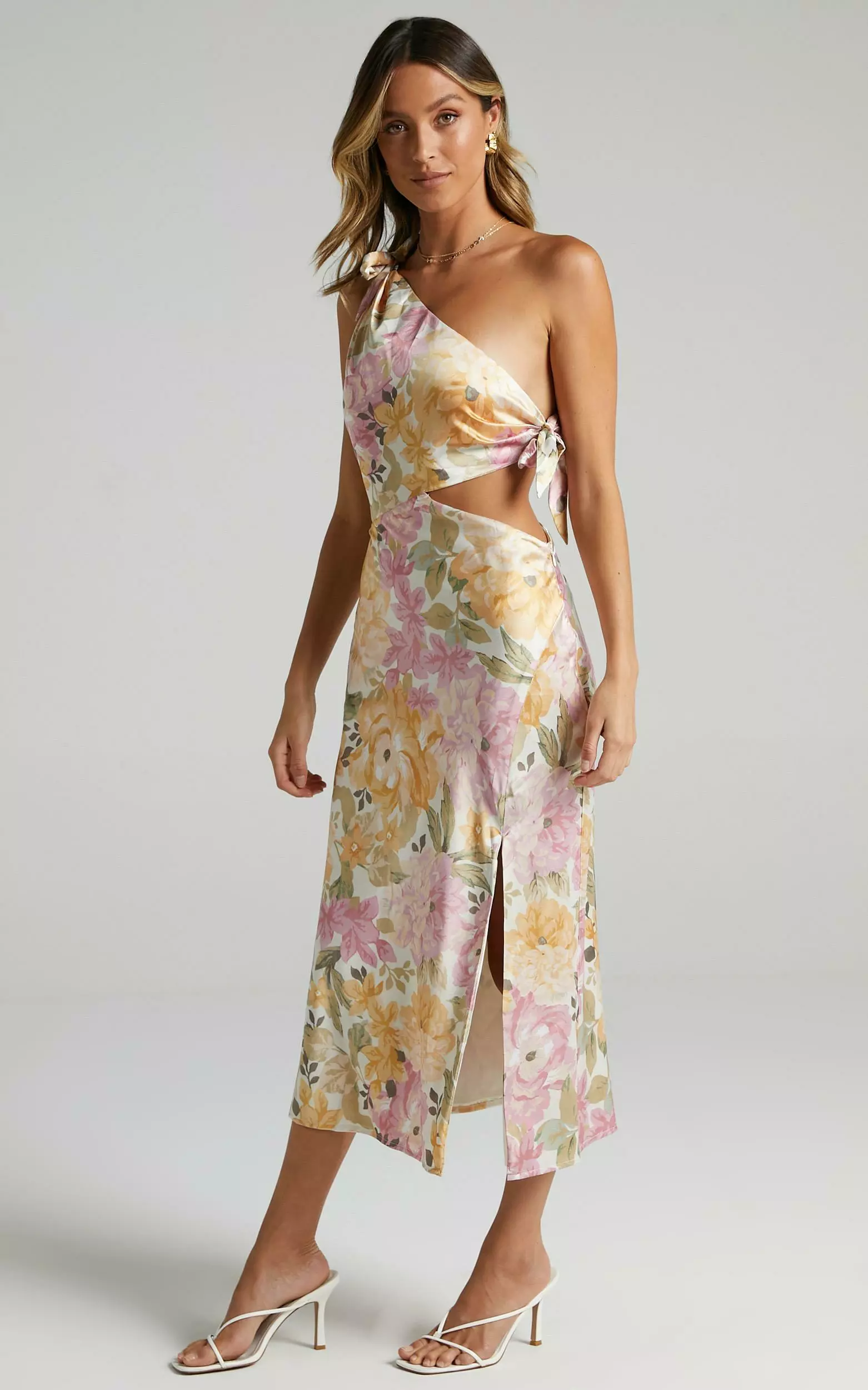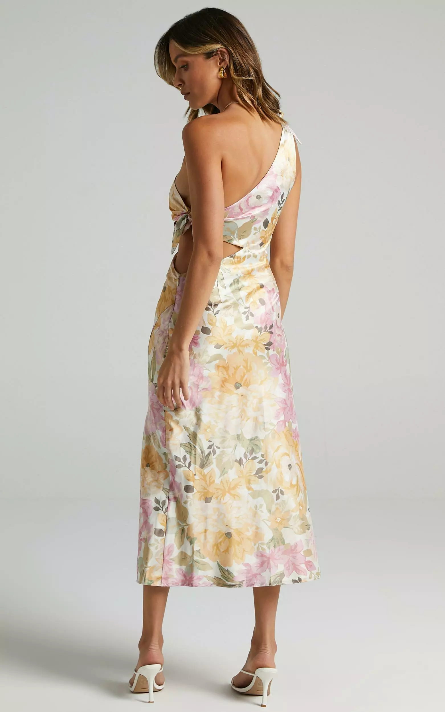 Feel flirty in floral in the Glaucus Dress! This one shoulder satin number has a tie wrap bodice on the left shoulder and waist. Featuring an enlarged pattern of bountiful flora in shades of blush pink, yellow and khaki, it falls to a midi length and reveals a side split which aligns with the cut-out detail.