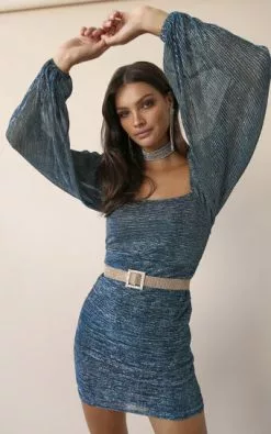 Have a glam moment in the Jamil Bodycon Mini Dress! This eye-catcher is shaped with long sheer balloon sleeves, a square neckline and fitted to a bodycon silhouette. It’s finished in a crinkled high shine lurex material for a glittering factor! Pair it with your best pumps and illuminating eye makeup for an evening glow!