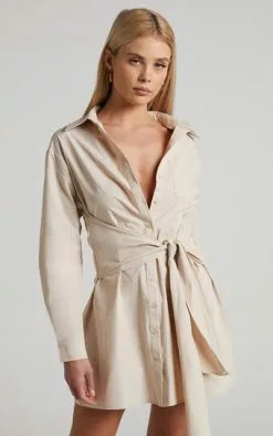 You’ll be all set for date night with our Macie Tie Front Shirt Dress! This chic mini dress features a pointed collar, a waist tie, a patch pocket and long sleeves with cuffs. It’s such a flattering dress on and has a pretty A-line silhouette when tied back. Make it a fave this season for any upcoming occasions – casual or formal. Wear it to drinks with heels, statement jewellery and a mini handbag to complete the look!