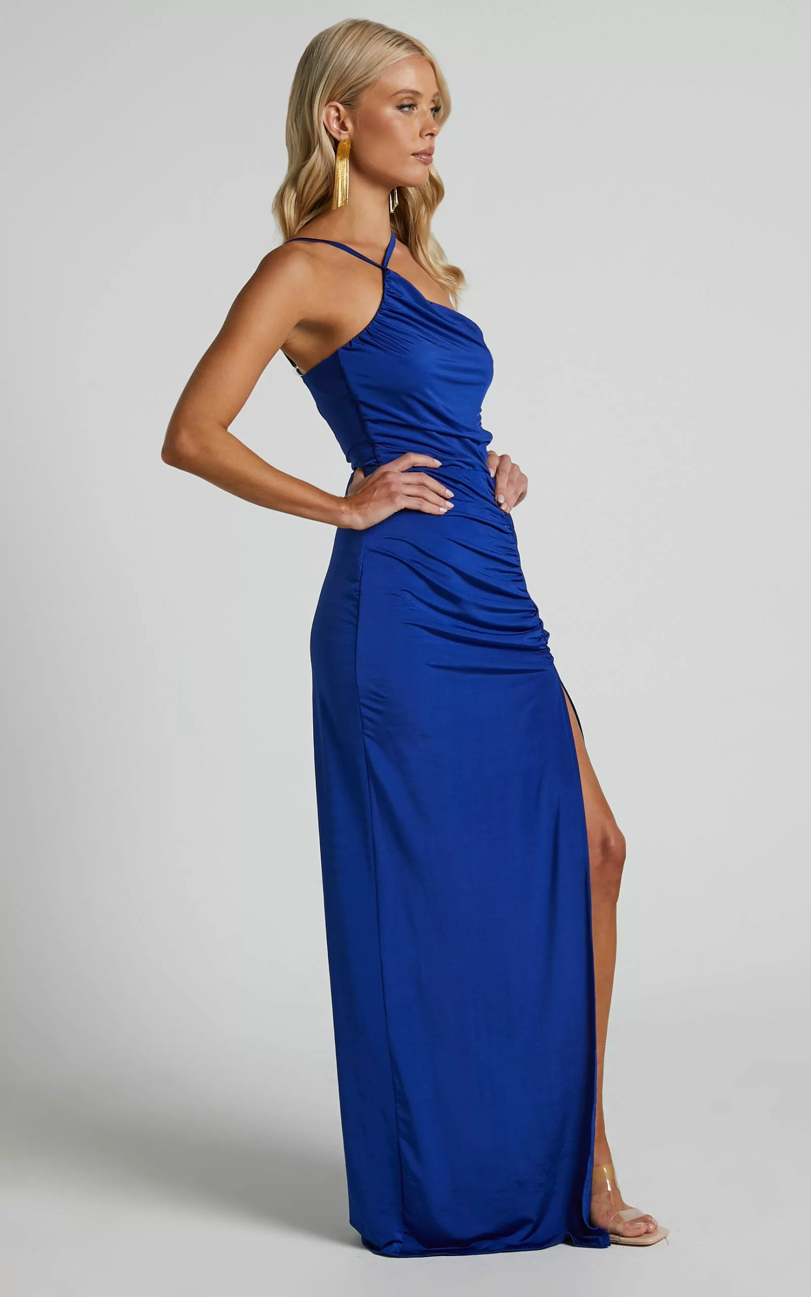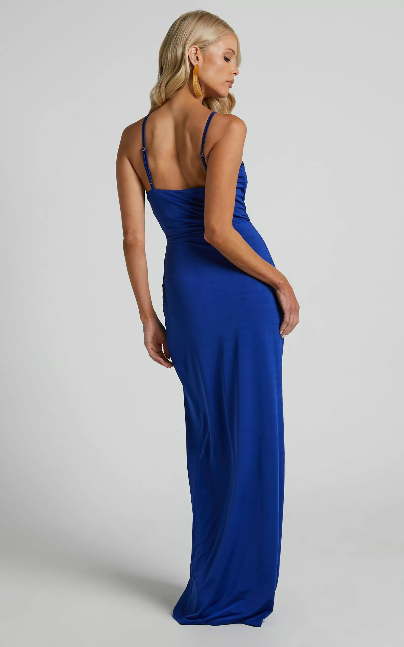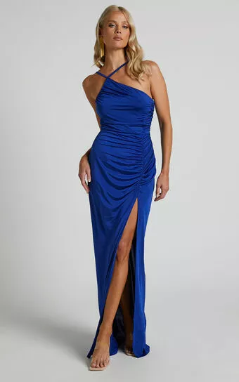Get ready to turn heads in our Mhira One Shoulder Side Split Maxi Dress in Blue!