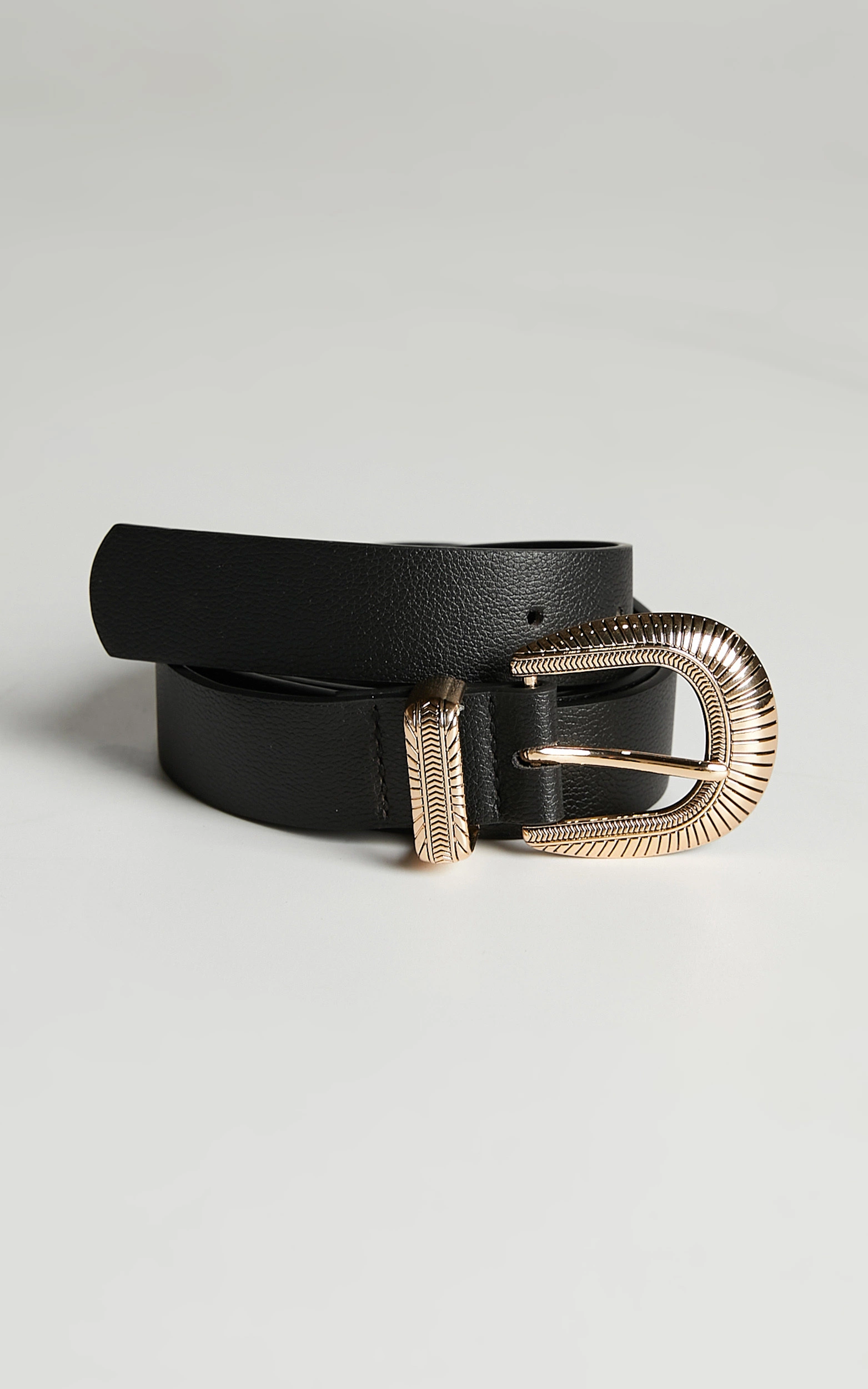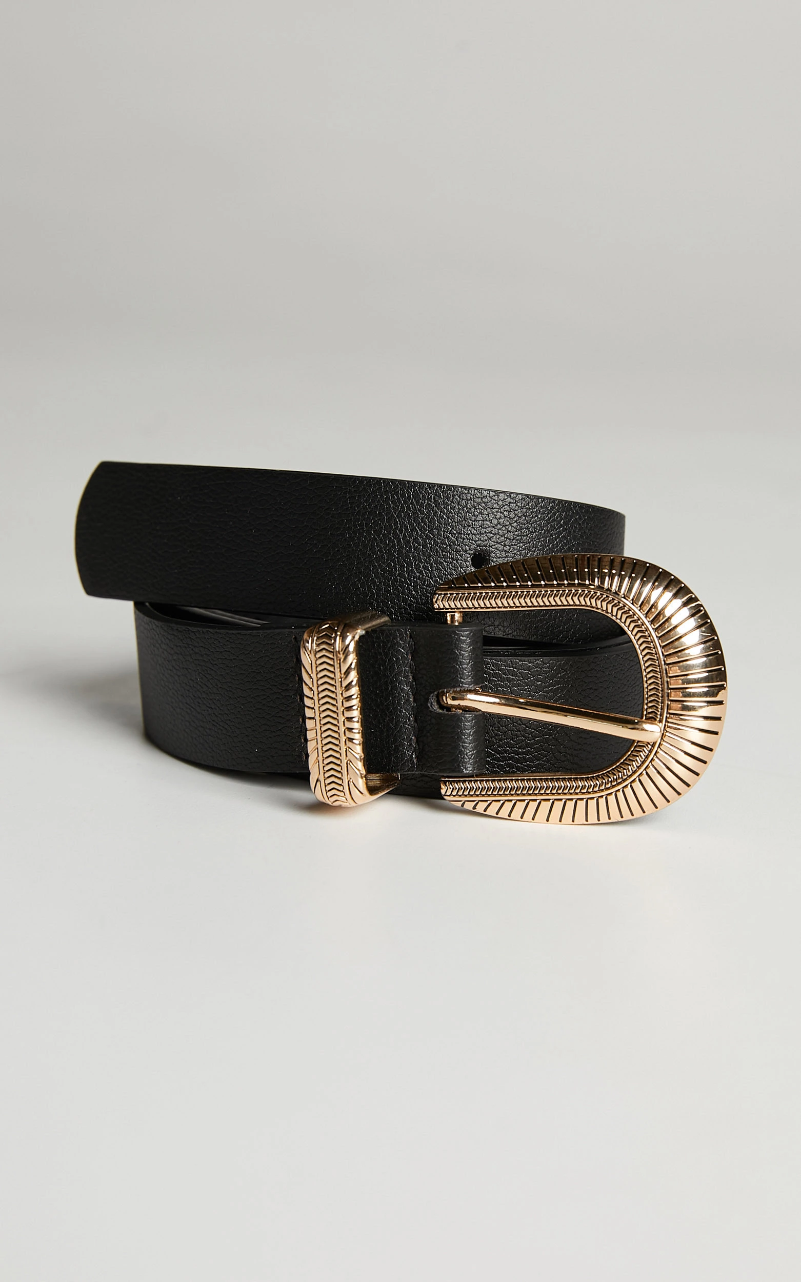 The Ramona Belt offers a sleek touch to your streetwear edits seen its faux leather grosgrain finish and gold tone hardware. It has a panelled sculptural buckle complemented with a a coordinating gold tone loop that neatly secures the waist. Add it to your high rise jeans and pull focus to its cool details with a crop top.