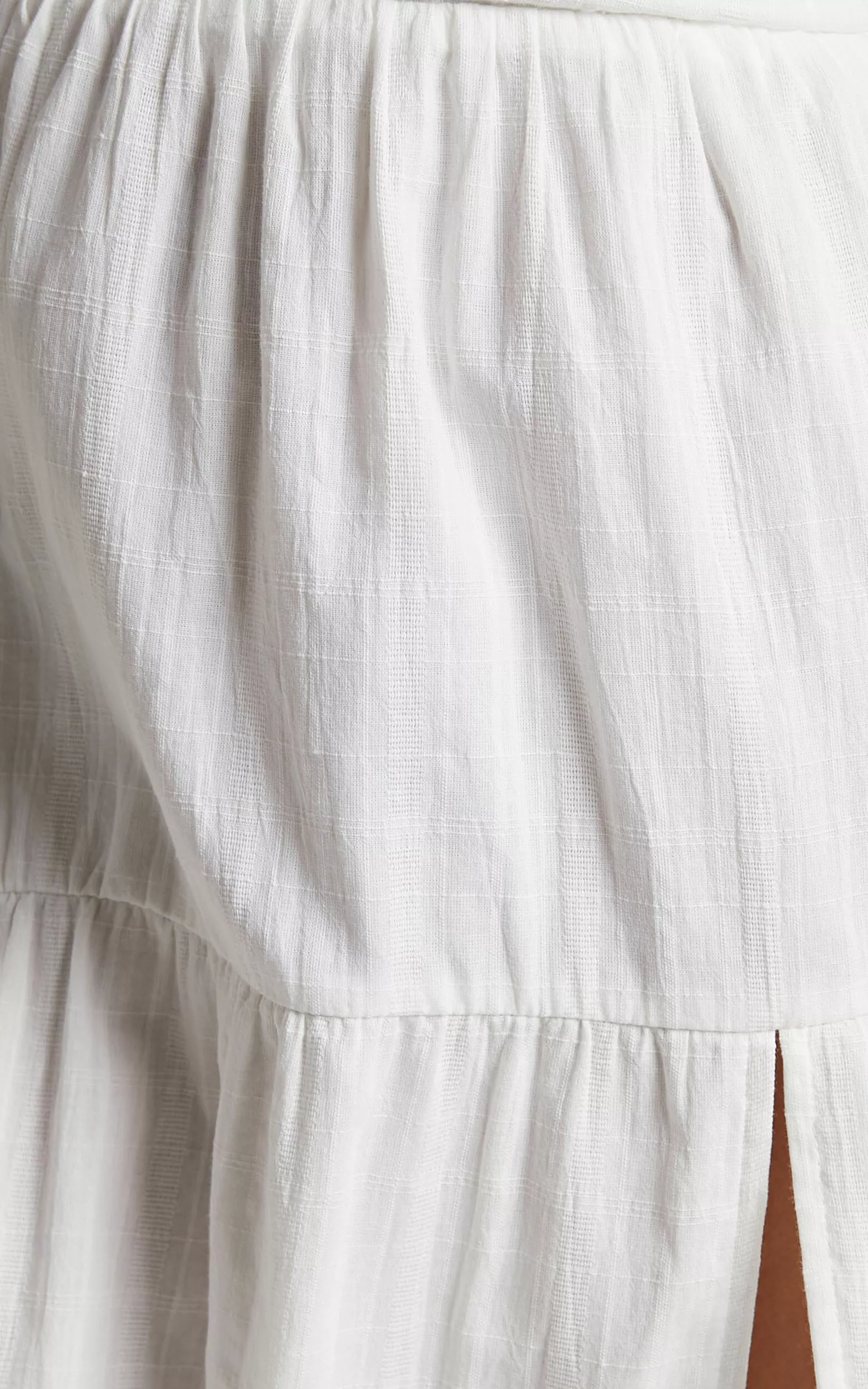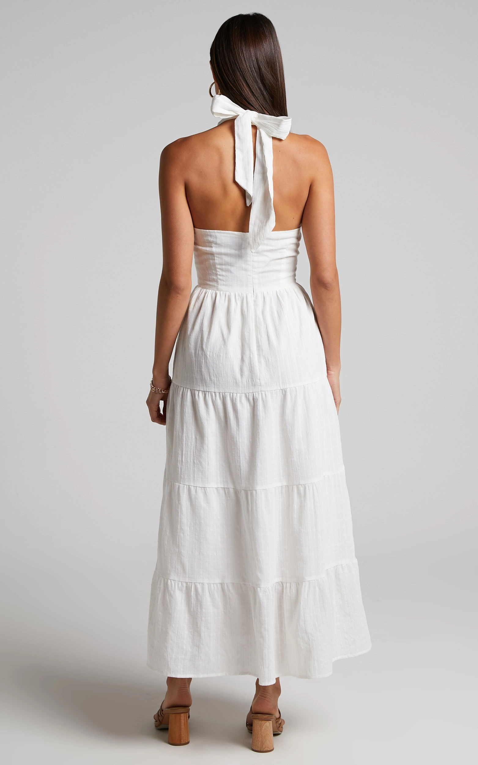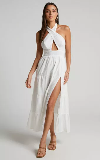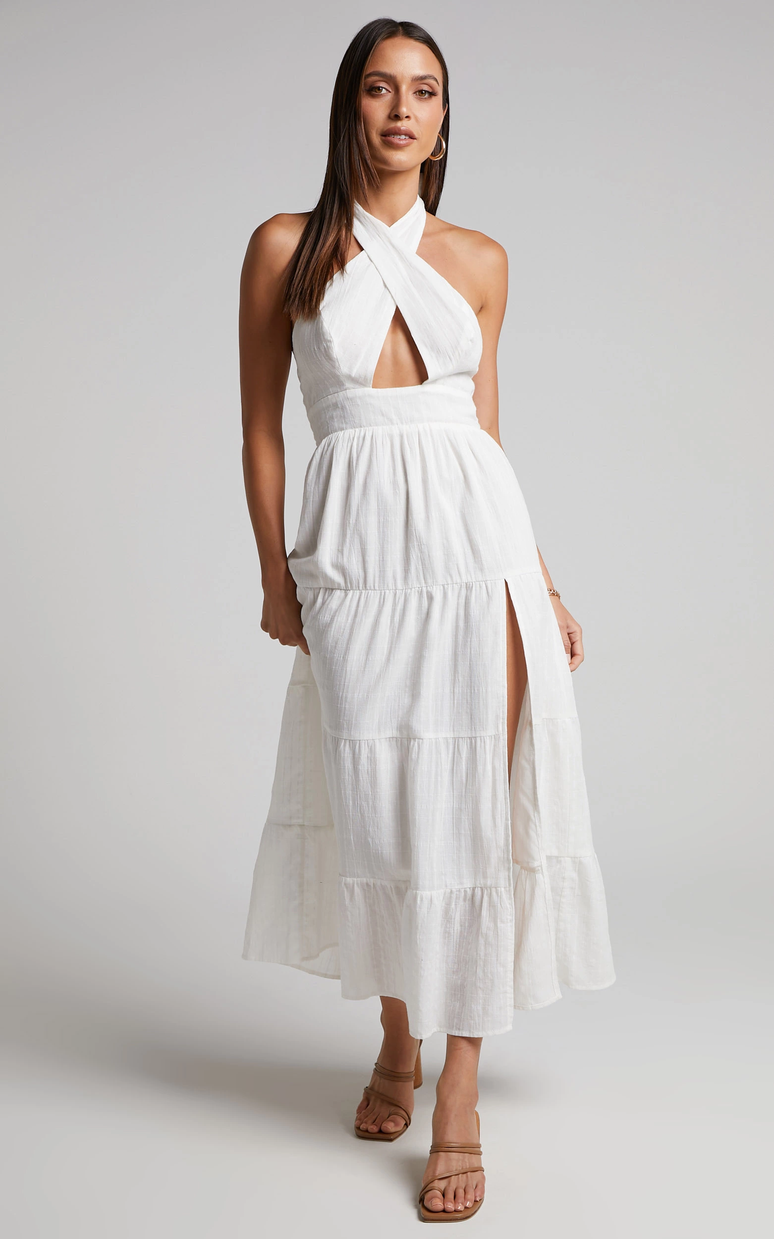 The perfect dress for sipping on fruity cocktails whilst spilling *all* the tea to the girls. Our Roella Dress features a cross halter neckline, keyhole cut out at the centre of the bust, fitted waistband, tiered skirt and a thigh high split. It’s effortless, timeless and easy to dress up or down. Style it with block heels, fine jewellery and add a mini handbag for a fresh look!