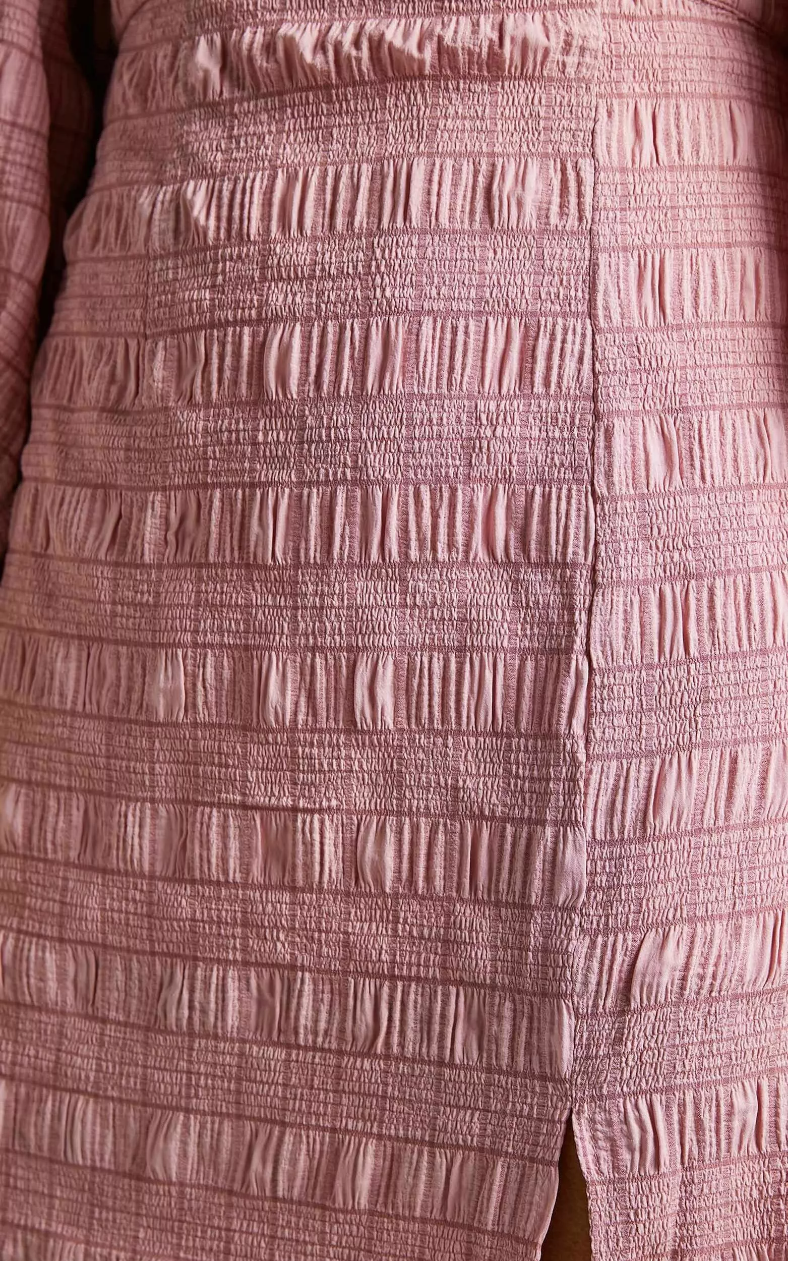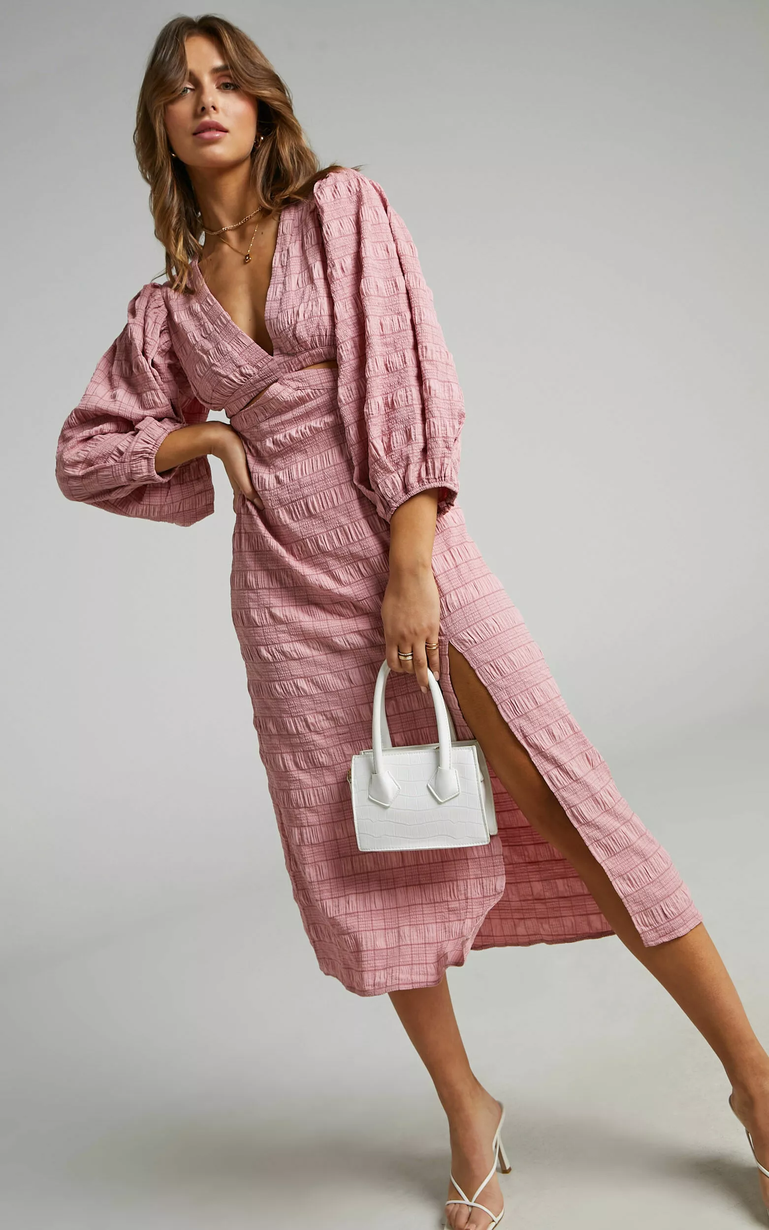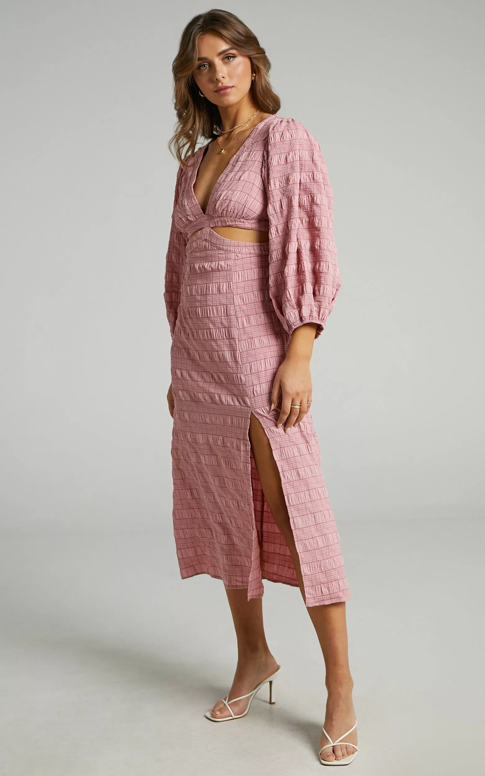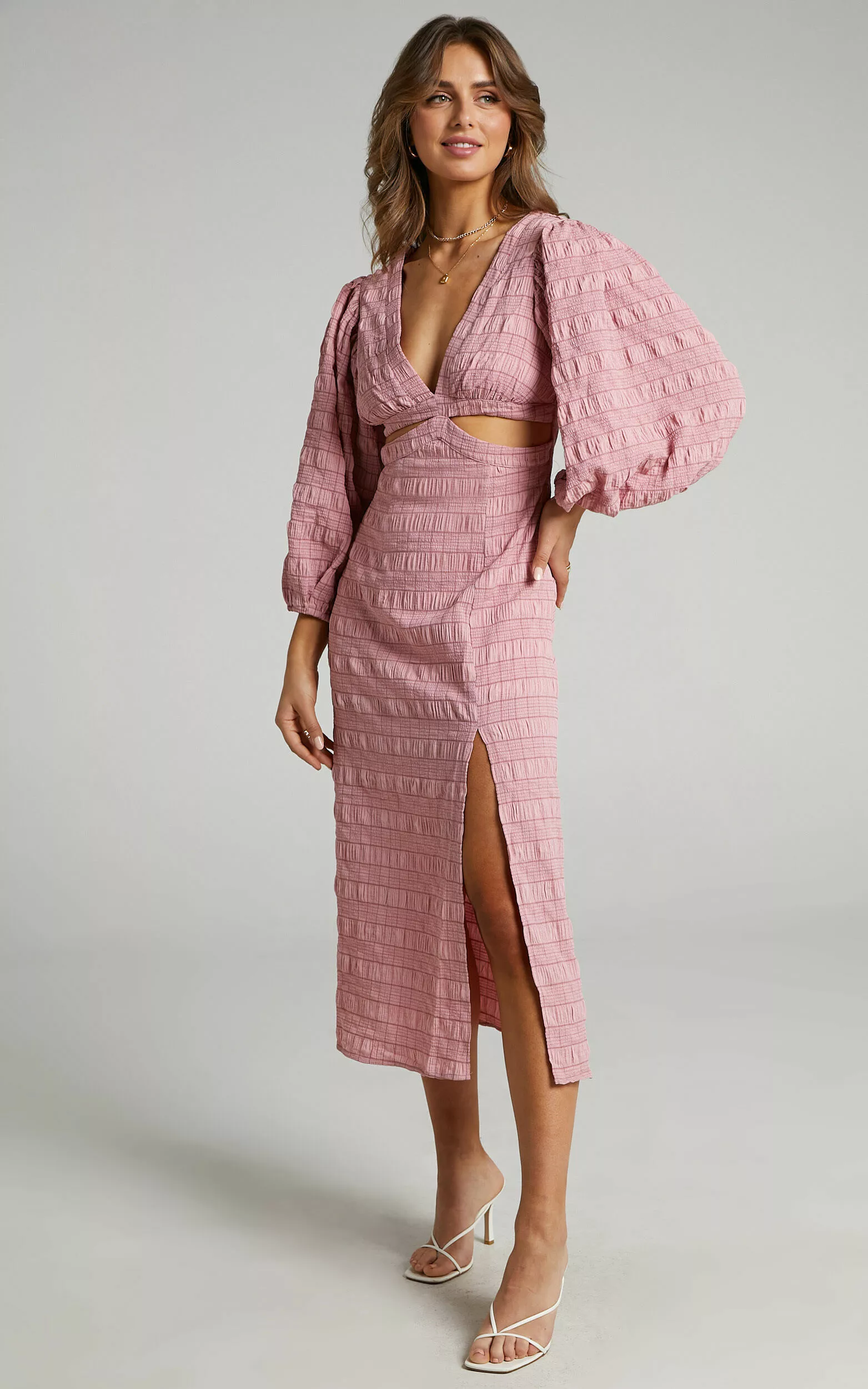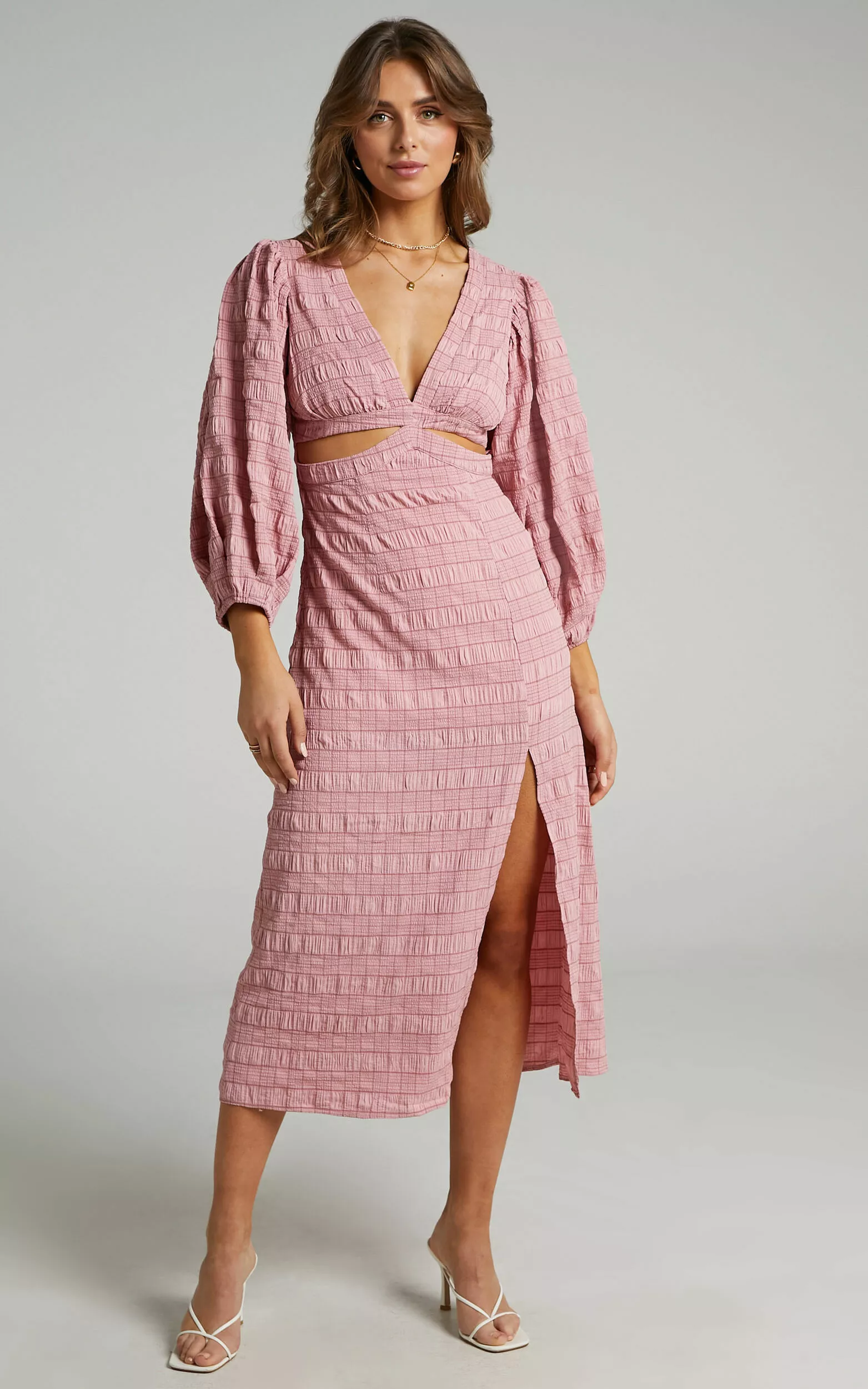 Fall in love with our totally dreamy Tabatha Midi Dress! This day-to-night number features a flattering A-line silhouette with puff sleeves, side cut outs and a flowing skirt with a cheeky thigh split. Made from a soft fabric with textured check shirring, it will keep you cool and comfortable in the warmer months.